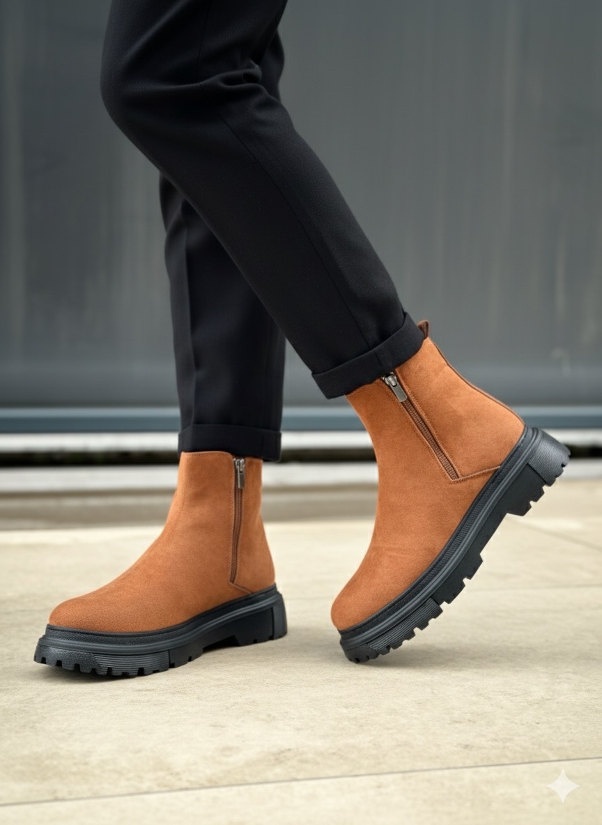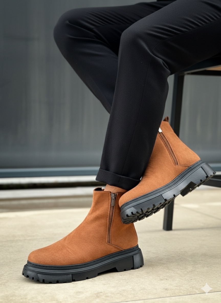 • LVO0777 Süet Taba Siyah Taban Çift Fermuarlı Erkek Yarım Bilek Bot