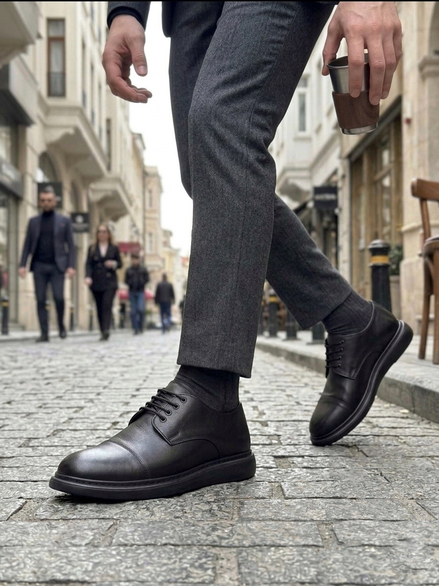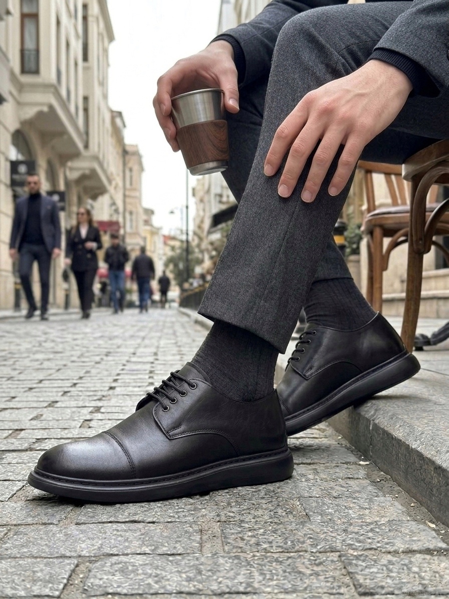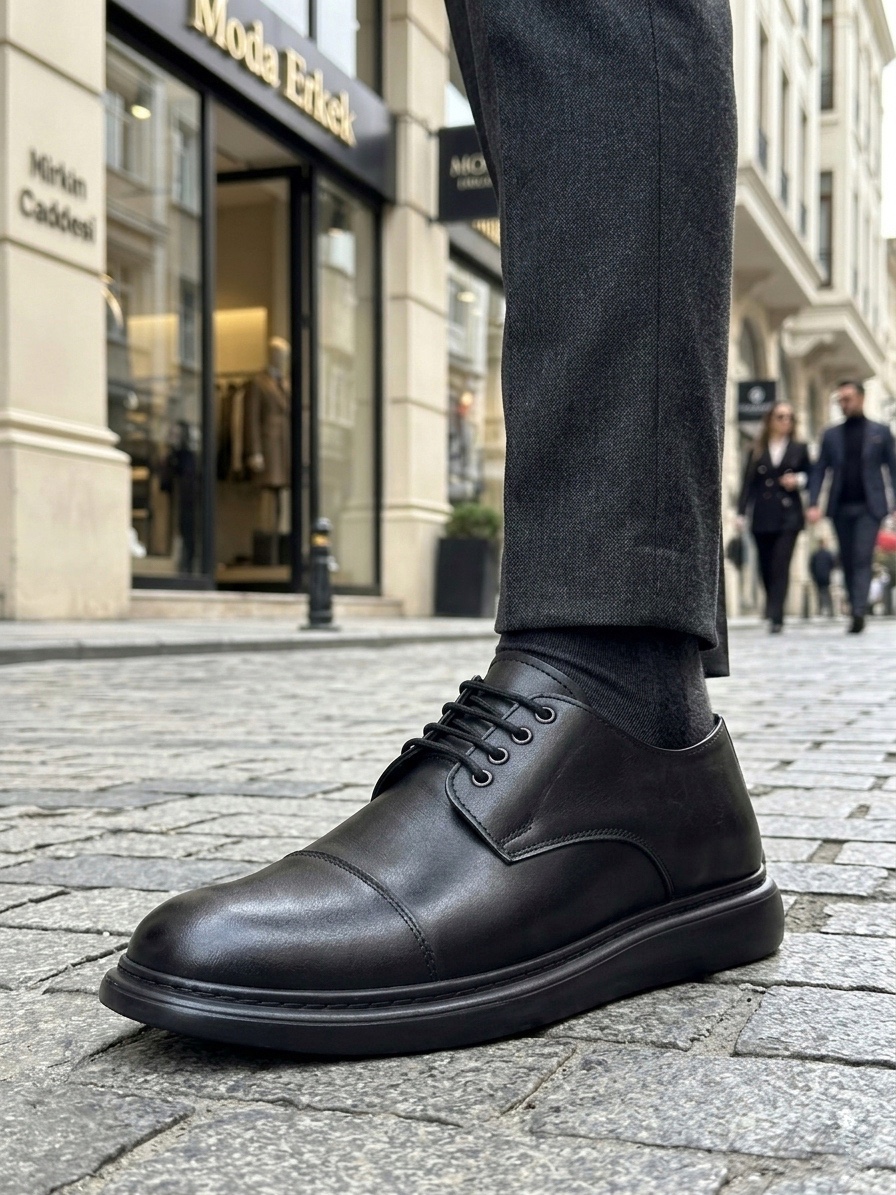 LVO0003 Siyah Kapaklı Burun Bağcıklı Erkek Oxford Ayakkabı