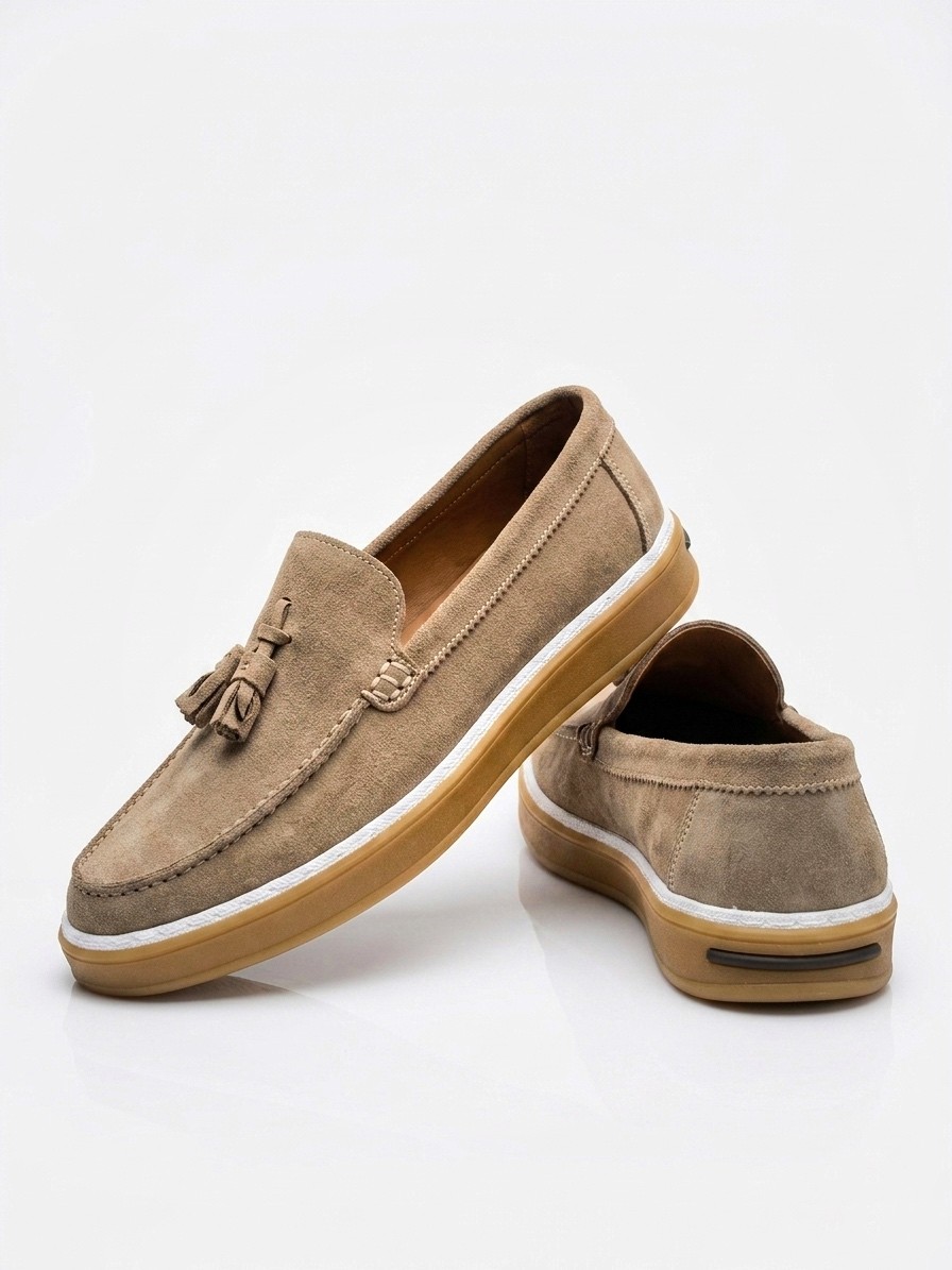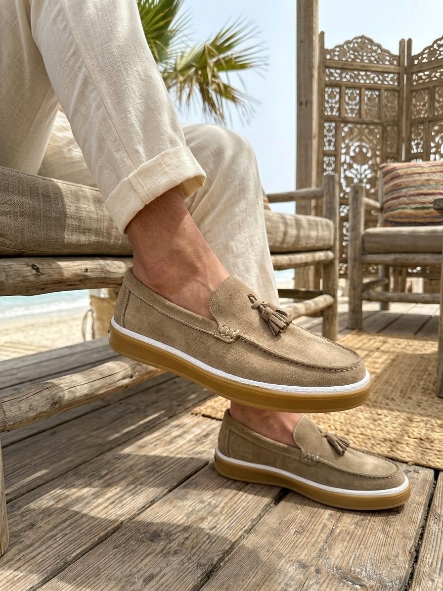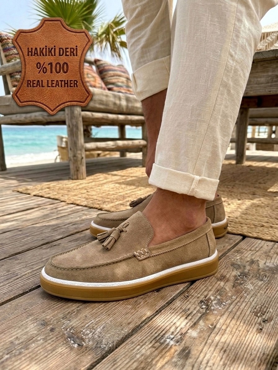 • LVO0250 %100 İçi Dışı Hakiki Deri Erkek Bej Süet Casual Loafer Püskül Detaylı Kauçuk Rahat Taban Dikişli Ayakkabı