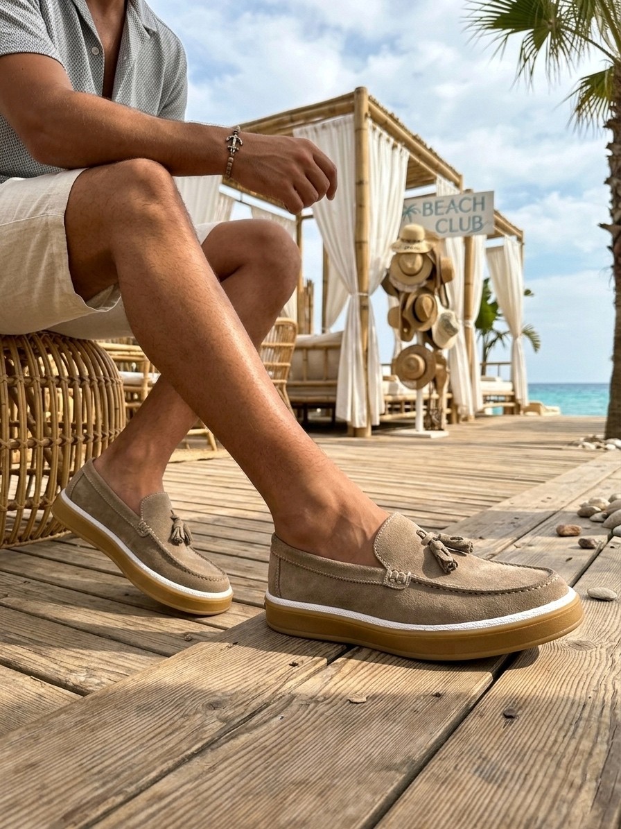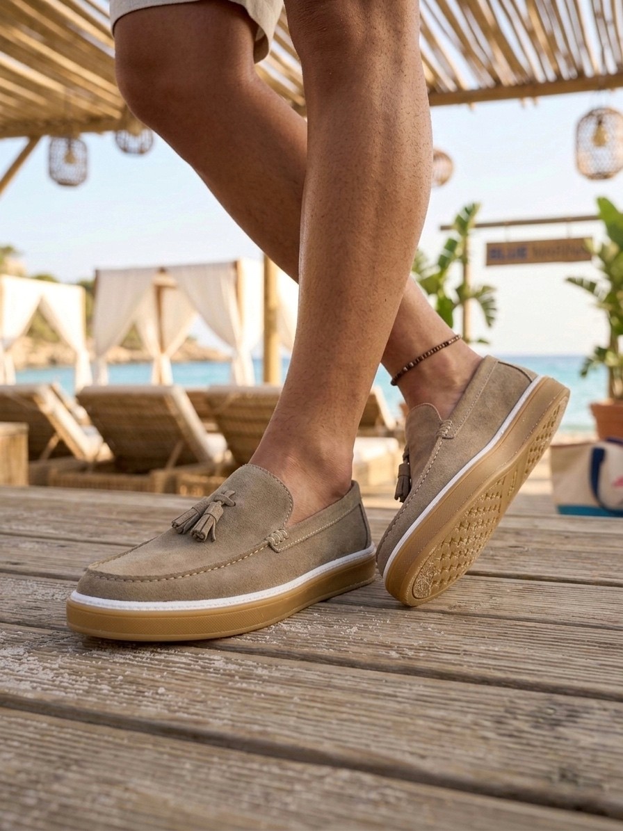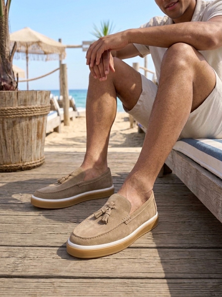 • LVO0250 %100 İçi Dışı Hakiki Deri Erkek Bej Süet Casual Loafer Püskül Detaylı Kauçuk Rahat Taban Dikişli Ayakkabı